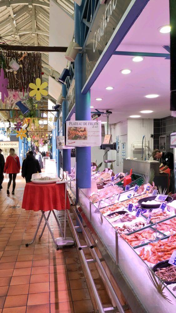 Am Place de Jean-Paul II neben der Kirche die Markthalle, die uns magnetisch anzog. Wir merkten gleich, wieder in Frankreich zu sein, am Nachmittag noch geöffnet und voller leckerer Sachen, Savoir-vivre, wie man es liebt.