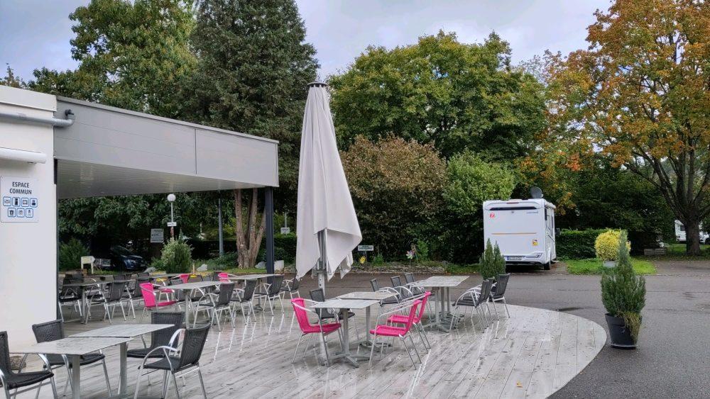 Weiterhin bedeckter Himmel mit vielen Wolken, Regen, die ersten 100 km Autobahn und Nationalstraßen. In den Vogesen auch mal kurzzeitig Nebel. Wieder viele – auch sehr enge – Kurven, mehrfach 6% Gefälle, wobei es mir vorkam, als wenn es steiler bergab ging. In Mulhouse lag der Campingplatz Municipal unmittelbar an der L’Ill. 13.02 Uhr Ankunft, Schranke ab 13 Uhr bis 15 Uhr geschlossen, Rezeption unbesetzt. Ein Mann erschien apfelessend, bot an, uns einzulassen und dirigierte mich zu einem Stellplatz, gestikulierend signalisierte er die Frage „Strom“? Jola musste ihm für die Gefälligkeit einen Kaffee ausgeben. Immerhin ersparte uns der Mann das Warten bis 15 Uhr. Der Anbau (teilweise im Bild) neben der Rezeption wirkte neueren Datums.