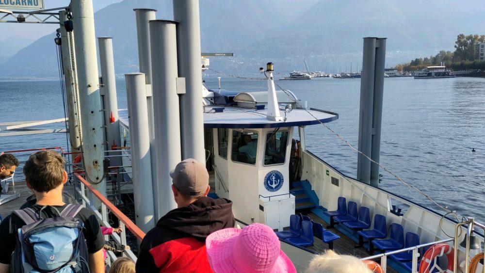 Wir bummelten danach durch die Altstadt, suchten die Talstation der Seilbahn, die hinauf zum Cimetta (1679m) führen soll. Auf dem waren wir bereits im Jahre 2004. Wieder an der Anlegestelle der Fähre, stellten wir fest, das Schiff legte gerade ab (14.10 Uhr). Nächste Abfahrt 15.50 Uhr! Was machen so lange. Busfahren! Dafür entschieden wir uns, für uns mit der Tessin-Karte als öffentlichen Verkehrsmittel kostenlos, stiegen in den nächsten an der Station haltenden Bus ein, der uns nach Ascona mitnahm. Wir waren mit unserem Wunsch nicht allein, kein Sitzplatz zunächst und schlechte Luft im Innern und ein hässliches Geräusch bei jeder Ankündigung des Türenschließens. Viel Zeit blieb in Ascona nicht, es passte aber, 20 Minuten vor Abfahrt der Fähre saßen wir am Anleger und warteten mit zig anderen Fahrgästen.