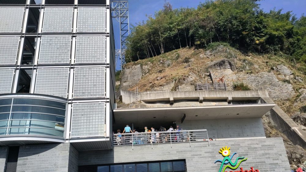 …dann als menschliche Sardine in der Kabine in ca. 6 Minuten von 378m auf die Höhe von 1332m zur Zwischenstation Cardada hinaufgeschafft.