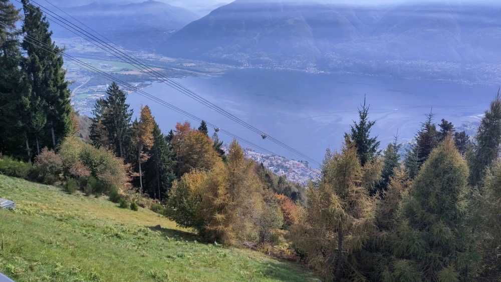 An der Talstation Orselina hieß es nach dem Kauf der Tickets warten, jeweils 40 Personen durften mit der Kabinenbahn dem Gipfel entgegenstreben. Zeit für den Blick ins unten liegende Locarno und die Kirche Madonna del Sasso….