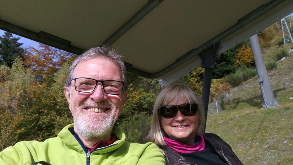 Jola hatte den Platzwechsel derweil eingeleitet, Umzug auf Platz 63, quasi 3 Querstraßen weiter. Nun Blick auf die Sanitäranlegen und den Kinderspielplatz mit seinem Trampolin, das permanent in Beschlag genommen wurde. Die Kleinsten trugen möglicherweise noch Windeln, konnten aber schon einen Salto machen. Kinderstimmen, wenn nicht von Schreikindern kommend, klingen eher angenehm in den Ohren, hingegen störte das Blasen der elektrischen Handtrockner aus dem WC-Abteil erheblich. Immerhin vermittelte das im Sekundentakt ertönenden Geräusch ein Gefühl der Reinlichkeit bei den Campingplatznutzern. Gut, tagsüber waren wir ja unterwegs, heute Erinnerungen auffrischen. Der Cimetta (die oder das?) sollte nach 2004 wieder besucht werden, 1671m hoch gelegen, über eine Seilbahn erreichbar.