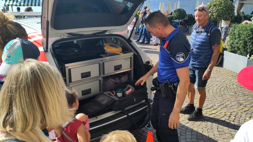 Die Polizei bemühte sich vor Ort um Aufklärung und zeigte Interessierten Zubehör aus einem Einsatzfahrzeug, was besonders die Kleinsten neugierig machte….