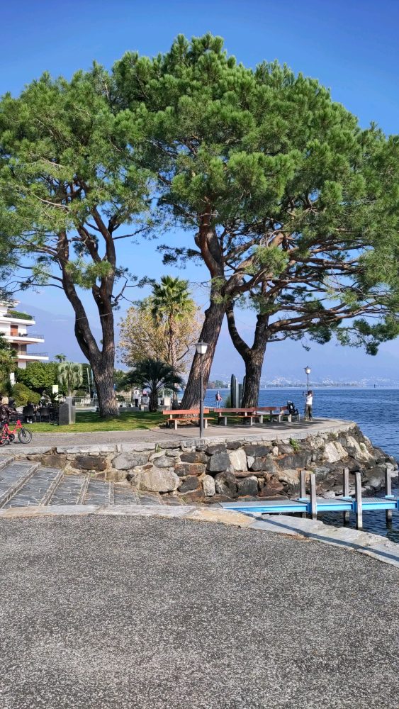 Uns fehlten ein paar Grundnahrungsmittel, u.a. Wein(??). Auf die Räder, fertig, los… zur Suche nach der Shopping-Mall. Tenero bot abseits vom Campinggelände zunächst viel Verkehr, eine Baustelle mit Ampelschaltung und das ersehnte Center in Sichtweite, COOP. COOP, nicht wie bei uns, ein Gebäudeverwalter, hier eine Mall. An den höheren Preisen in der Schweiz wollten wir uns nicht übermäßig stören, der Einkauskorb war voll. Die Ware am WoMo abgeladen, dann Scout gespielt und ca. 5 km am See nach Locarno geradelt. Wir nahmen den „langsamen“ Weg, sprich, alle naslang gelb-schwarze Stoppschwellen. Soweit die Sonne heranreichte saßen die Menschen draußen in den Restaurants bei (gutem?) Essen und einem Gläschen, was auch immer.