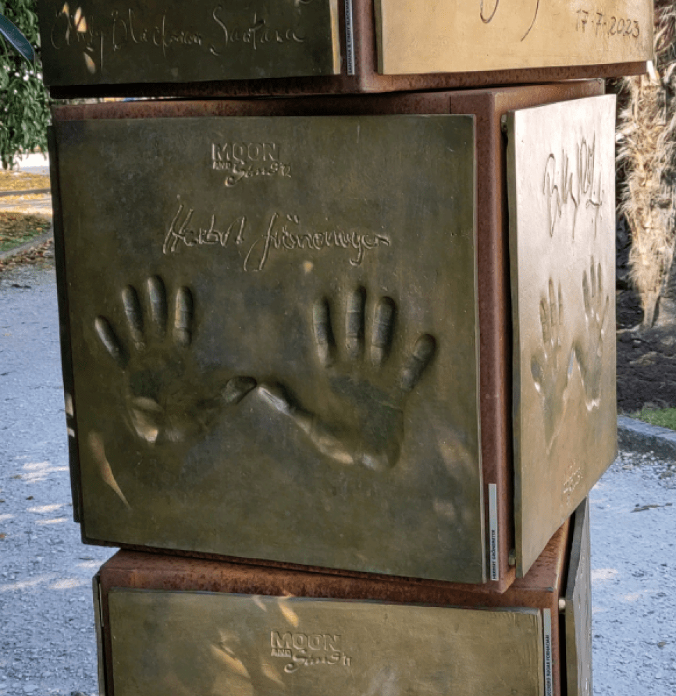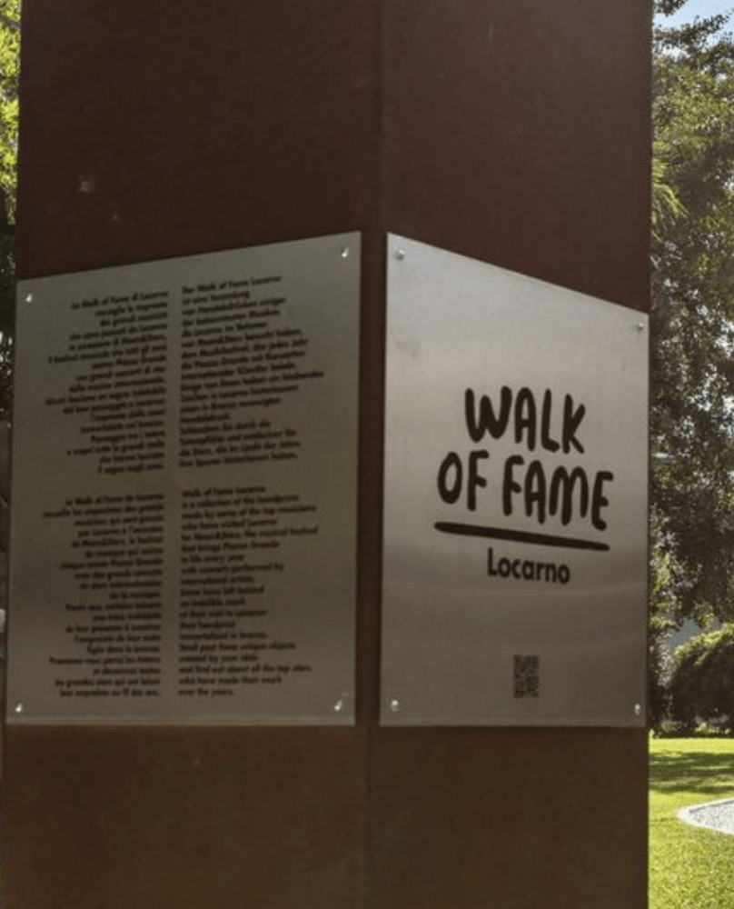 Selfie (blieb unveröffentlicht), unsere Pause auf den Außenplätzen der Bar La Vela in der Viale Verbano ebenso unabgelichtet. Es saß sich nett, Sonne, Blick auf den See, ein starker Cappuccino (Jola) und meine gekühlte Zitronenlimonade. In Locarno wiederholte sich das Angebot von Kunsthandwerkständen, ich überließ die Durchforstung Jola und wechselte in den daneben liegenden Park, wo ein Walk of Fame von Musikern eingerichtet war. Jeweils durften sie ihre Hände als bronzene Abdrücke nach ihren Konzerten im Rahmen des Festivals Moon & Stars hinterlassen.