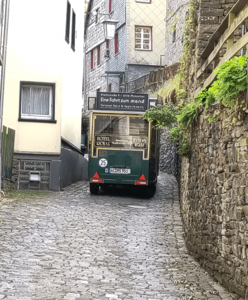 Die Altstadt von Monschau für Fahrzeuge gesperrt, Fahrräder waren damit nicht gemeint, trotzdem ließen wir sie gegenüber der versteckt liegenden Sparkasse neben einer Büchertelefonzelle stehen. Hier galt wohl bei der Gründung der Sparkasse noch „wer den Pfennig nicht ehrt, ….„