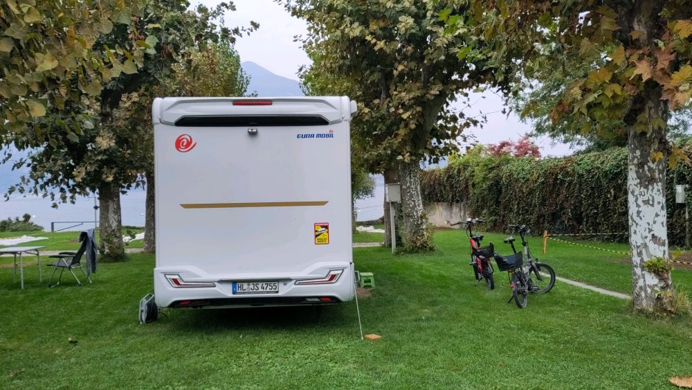 11.46 Uhr Ankunft am Campingplatz Iseo. Die „Chefin“, sportlich in Leggings, dirigierte mich zu unserem Platz, nachdem wir ihn per pedes gemeinsam inspiziert hatten. Unser Vorteil, sie sprach sehr gut deutsch, also musste nicht alles zweimal erklärt werden, weil vielleicht englische Vokabeln fehlte.