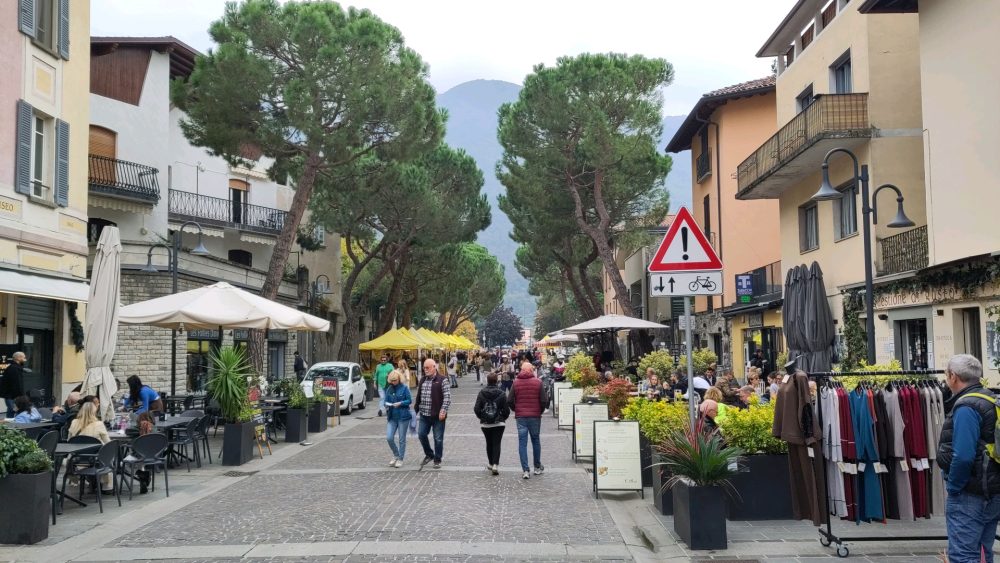 Leider blieb die lärmende Seestraße nicht immer so weit entfernt von uns, mehr als die Hälfte der rund 12 Km musste ich Gestank und Lärm einer Perlenkette aus Motorrädern und Autos ertragen. Clusane, Paratico und Sarnico hießen die Orte, in denen genauso viel Traffic herrschte, weil auch hier weiße Standzelte, Musikkapelle und Promenade Besucher angelockt hatte. Schöne Cafés mit leckerem Kuchen suchte ich vergeblich. Begnügte mich mit einer Rast in Sarnico im Fogg. Rund 12 Km hatten wir bis hier zurückgelegt. Trotz lauter musikalischer Beschallung, unaufmerksamer Bedienung und fehlendem Kuchenangebot saßen wir zur Rast, ich bestellte aus der Karte Dinge, von denen ich glaubte, das war etwas für mich, geblendet insbesondere von den traumhaft günstigen Preisen – ich erinnere, wir kamen just aus der Schweiz!!!! -. Mich belehrte die äußerst füllige Servicekraft, dass, was ich bestellen wollte, wäre eine Art Eiskaffee… Nein, dann doch ein Cappuccino und Dolce, wobei ich dann zeigte auf…? Da müsste ich mit ins Lokal und mir etwas aussuchen, sie mich so ins Innere lockte. Gut, es handelte sich um eine Art Kokosmakrone, mir recht. Ich durfte sie gleich mitnehmen. Bla, Bla, usw. Nahm eine zweite Makrone mit, in der Annahme, die Ehefrau, mich das Teil essen sehend, würde ebenfalls eine haben wollen. „Lecker„!, eine fachlich kompetente Beurteilung meiner weiblichen besseren Hälfte (gut, dass ich die zweite mitnahm).