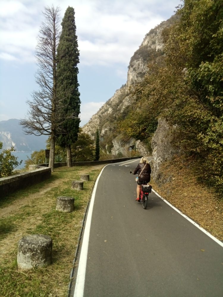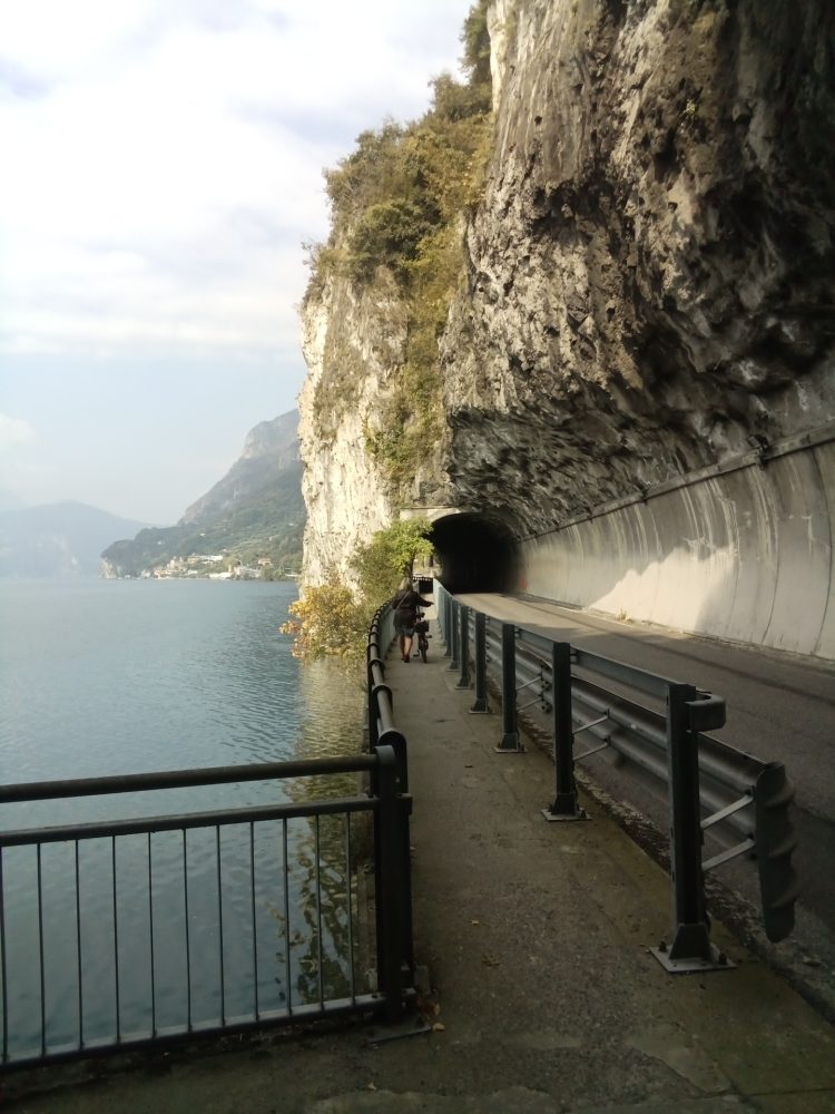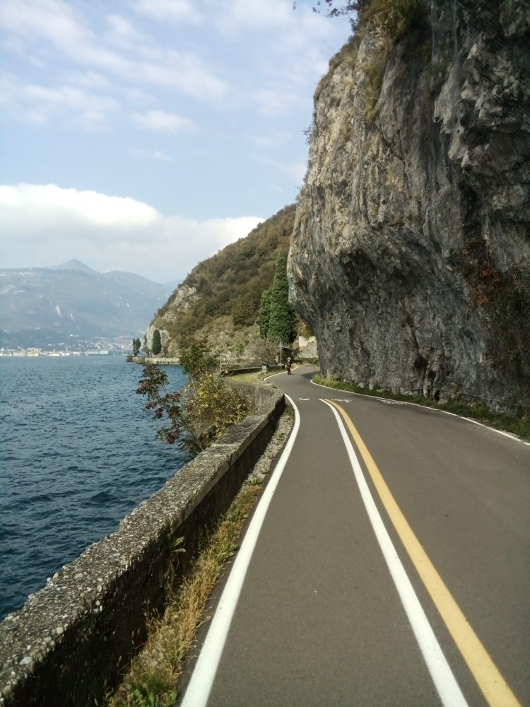 Das ursprüngliche Ziel, Marone, ließen wir hinter uns, es war jetzt einfach zu schön, um aufzuhören. Links ständig im See der Inselberg, rechts die steilen Hänge, in denen zwischen dem überwiegenden Grün (u.a. Olivenbäume) versprenkelt bunt wirkende Gebäude standen. Bei Vello begann dann der schönste Teil des Radweges, ca. 4 Km direkt am Fels und Ufer entlang, frisch geteerte Fahrbahn….