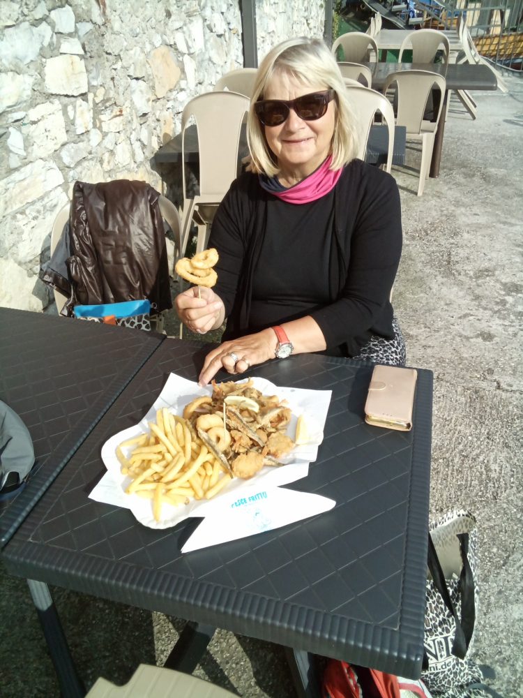 Nach gut 20 Km auf dem Tacho erreichten wir Toline, ein Ort ohne Ambitionen entdeckt zu werden. Wir pausierten, beschlossen, umzukehren. Na, was kommt jetzt? Richtig, der Imbiss in Marone, wir zeigten, was alles in die Tüte kommen sollte, die Mitarbeiterin schaufelte wie befohlen. 22,16 € mit Pommes. Heiß und frisch serviert genossen wir direkt am Wasser…..