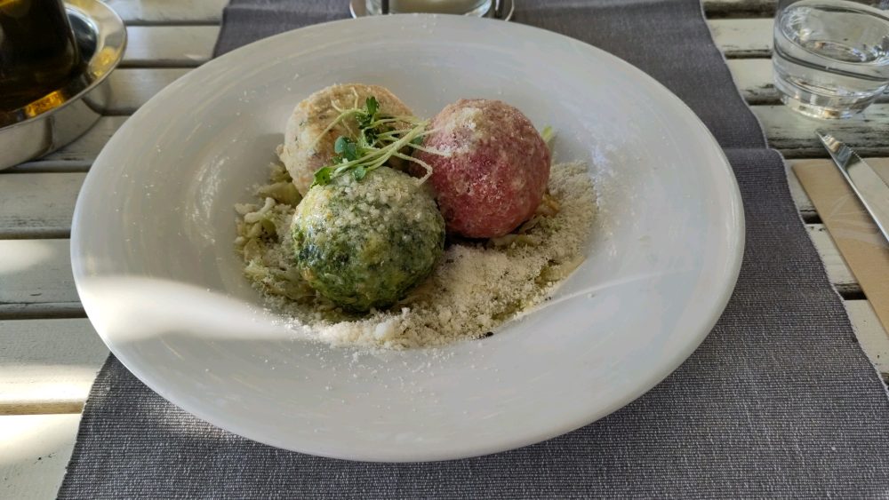 Im auf dem Gelände befindlichen Restaurant ein Mittagsimbiss, Jola bevorzugte Kürbis-Risotto, ich nahm Knödel-Tris….