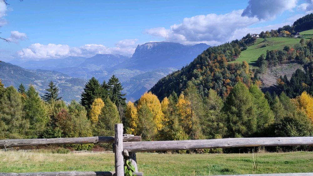 Nicht ganz so entschlussfreudig heute, kamen wir erst gegen Mittag in die Hufe. Ich glaubte, mit meinem Vorschlag, hinauf nach Kohlern zu fahren, bzw. uns hinaufbringen zu lassen, etwas Neues unseren Südtirolerlebnissen hinzufügen zu können. Die Seilbahn führe alle 15 Minuten, nur zwischen 11 und 12 Uhr sei Mittagspause, erfuhr ich von der Webseite. Wir radelten 12.15 Uhr los, wieder den angenehmen Radweg an der Eisack und dem grünen Gürteln mit etlichen Kinderspielplätzen entlang. Jola meinte an der Talstation bereits einmal hier gewesen zu sein, für mich aktuell alles Neuland. Kein Kassenhäuschen, bezahlt werden musste „oben“. Räder durften ein paar Stufen bis zur Gondel getragen werden. Mit uns noch zwei weitere Paare in der Gondel, die uns zügig auf über 1.100m transportierte. 8 € für die beiden Räder waren extra zu entrichten, mit der Bozen-Card fuhren wir umsonst.