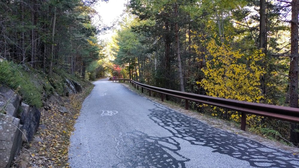 …. jedenfalls war es anstrengend, beide Hände ständig im mehr oder weniger festen Bremsmodus zu belassen. Ich versuchte durch Slalom fahren etwas Geschwindigkeit herauszunehmen. Kalt war es im Schatten naturgemäß auch, aber wir haben es überstanden und wärmten uns auf der Kampiller-Brücke ein bisschen auf.